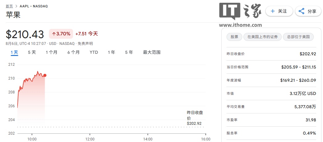 受此消息影响,苹果股价开盘后迅速走高,目前涨幅 3.70%,报价 210.43 美元每股,市值 3.12 万亿美元(现汇率约合 22.43 万亿元人民币)。